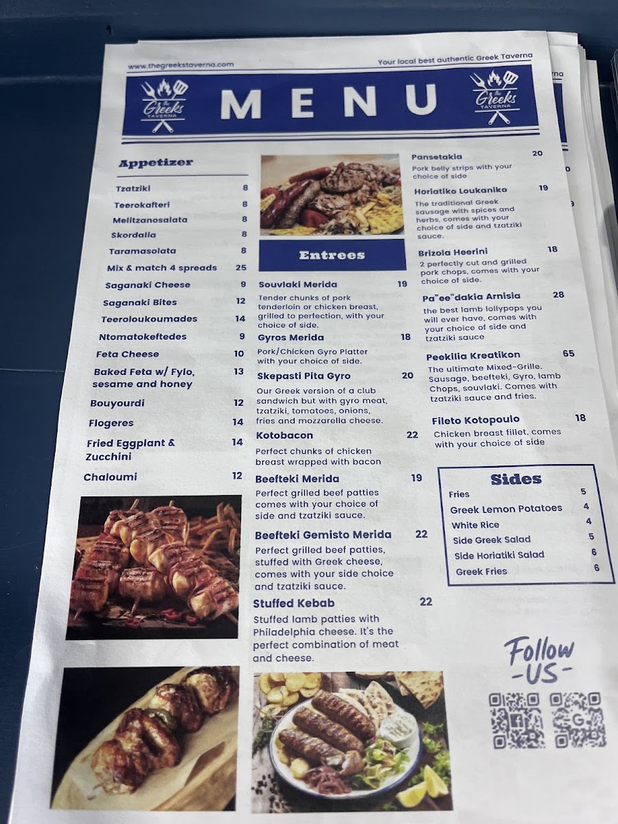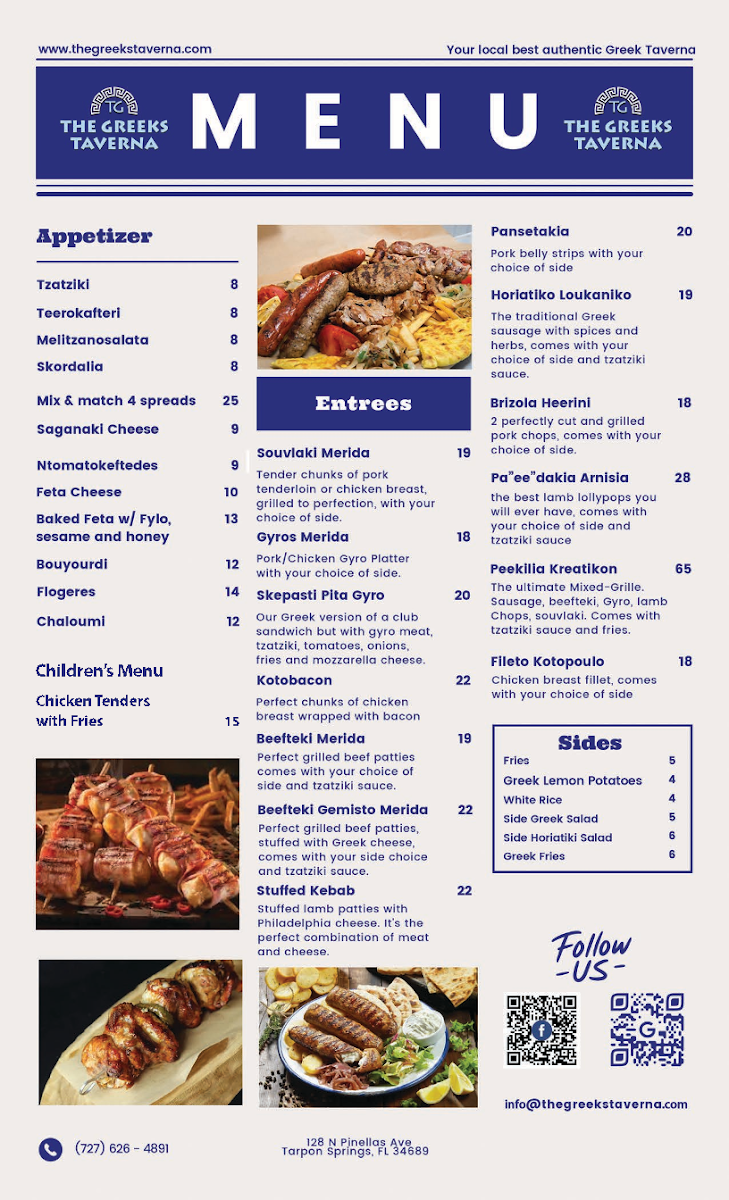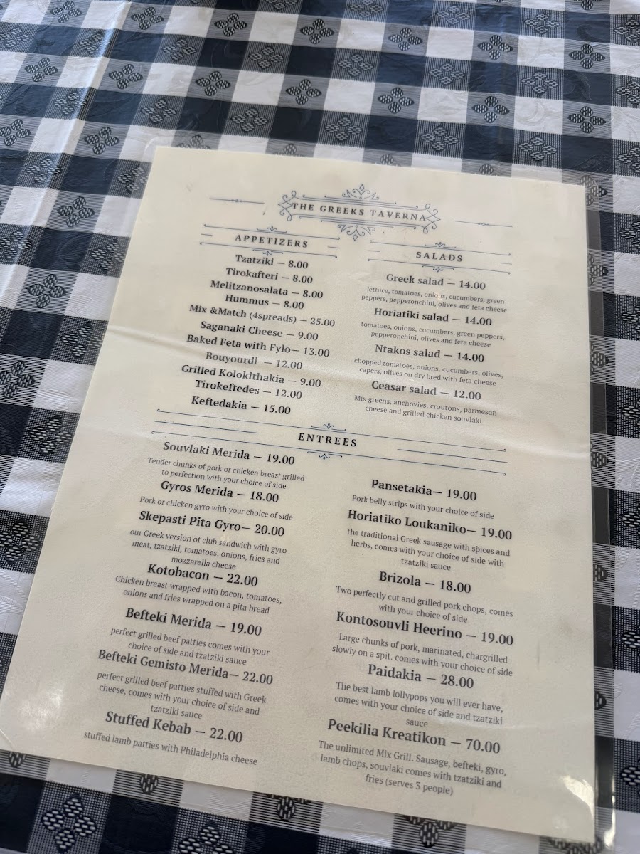The menu at The Greeks Taverna offers a delightful mix of traditional Greek dishes that are sure to please any palate. For appetizers, guests can enjoy options like Tzatziki, Teerokafteri, and Melitzanosalata Skordalia. For those who want to try a variety, the Mix & Match 4 Spreads is an excellent choice. The children's menu features a simple yet satisfying Chicken Tenders with Fries. As for the entrees, the restaurant serves generous portions of Souvlaki Merida, Gyros Merida, and Skepasti Pita Gyro Kotobacon, along with the flavorful Beefteki Merida. To complement the main dishes, a variety of sides are available, such as crispy Fries, tangy Greek Lemon Potatoes, and fragrant White Rice. Additionally, guests can add a Side Greek Salad or a Side Horiatiki Salad for a fresh, vibrant touch.