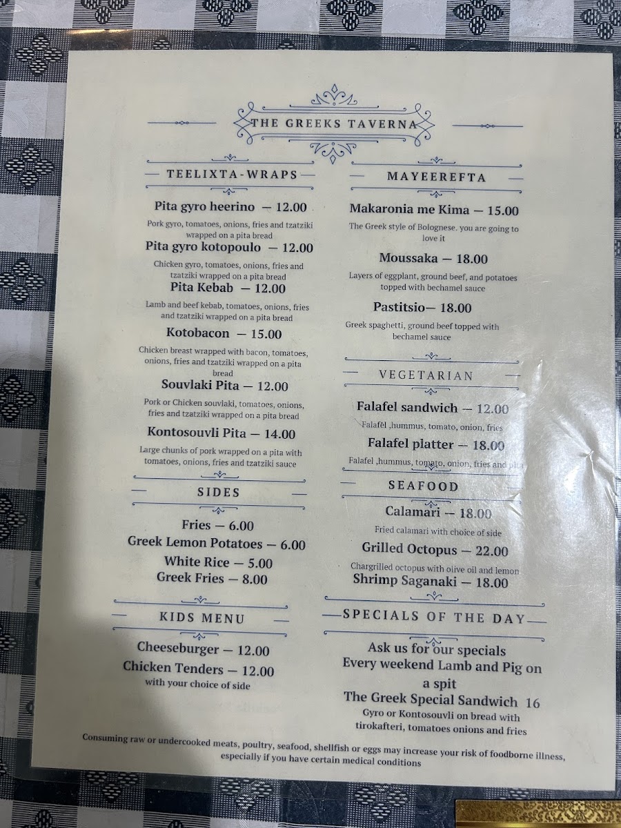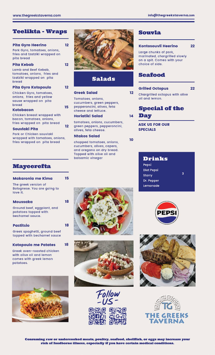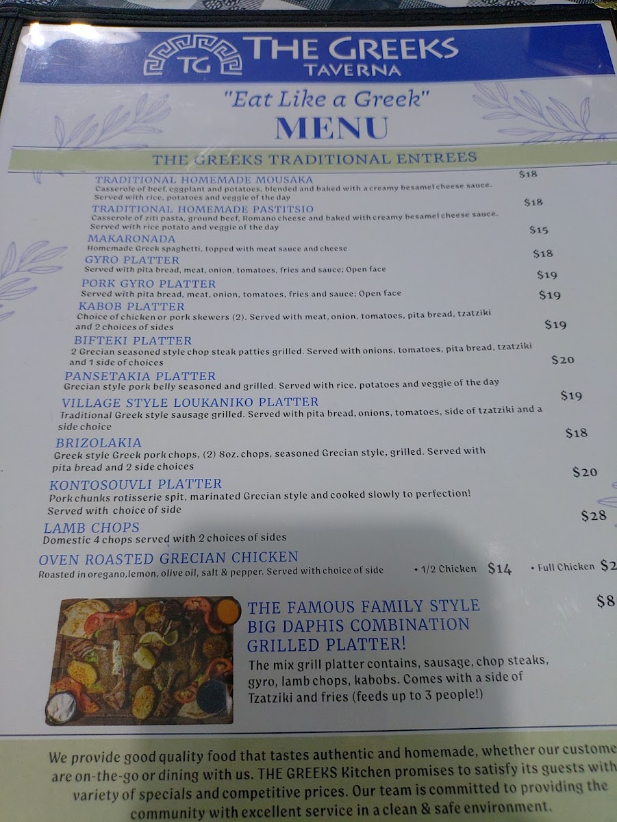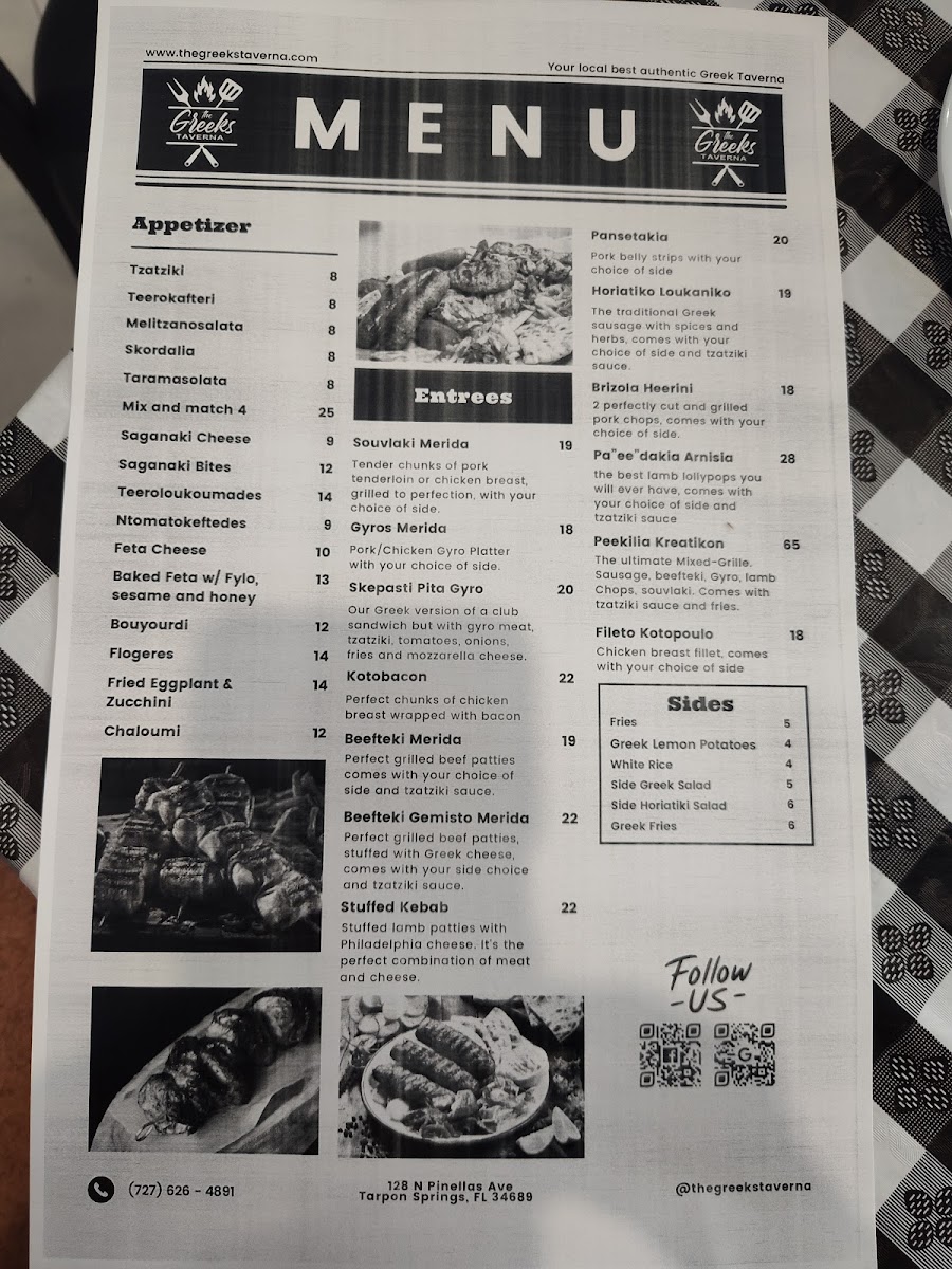 The menu at The Greeks Taverna offers a delightful mix of traditional Greek dishes that are sure to please any palate. For appetizers, guests can enjoy options like Tzatziki, Teerokafteri, and Melitzanosalata Skordalia. For those who want to try a variety, the Mix & Match 4 Spreads is an excellent choice. The children's menu features a simple yet satisfying Chicken Tenders with Fries. As for the entrees, the restaurant serves generous portions of Souvlaki Merida, Gyros Merida, and Skepasti Pita Gyro Kotobacon, along with the flavorful Beefteki Merida. To complement the main dishes, a variety of sides are available, such as crispy Fries, tangy Greek Lemon Potatoes, and fragrant White Rice. Additionally, guests can add a Side Greek Salad or a Side Horiatiki Salad for a fresh, vibrant touch.